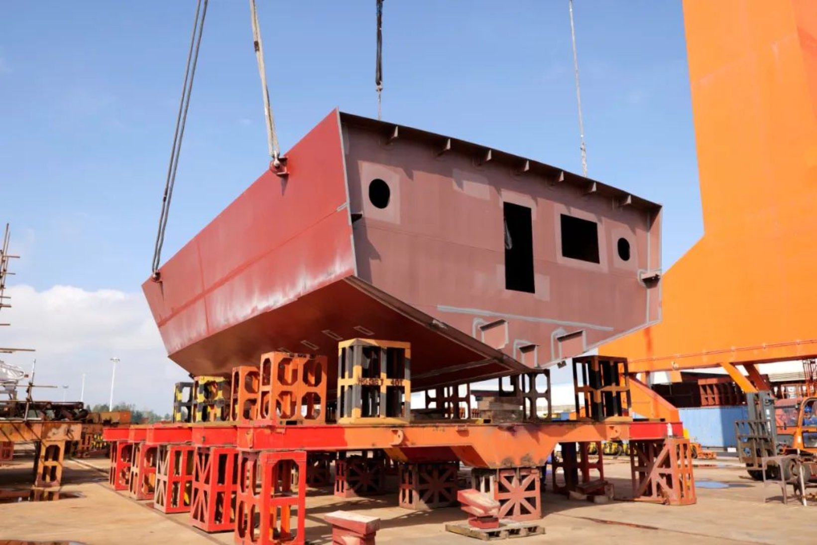 10月8日,由武昌造船为连云港市海洋与渔业综合行政执法支队打造的新建300吨级渔政执法船,在监理、项目三总师及参建单位相关负责人的见证下,顺利上船台,标志该船正式进入船台搭载阶段。