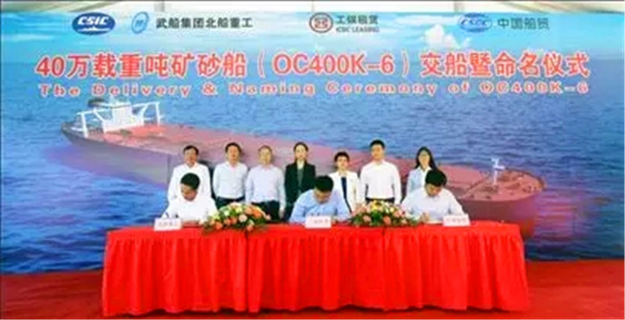 40万载重吨矿砂船6号船交船暨命名仪式在北船重工造船8号码头举行。北船重工副总经理于宝月主持仪式,武昌船舶重工集团有限公司党委委员、北船重工总经理王国海和工银金融租赁有限公司资产管理部负责人戴琳先后致辞。