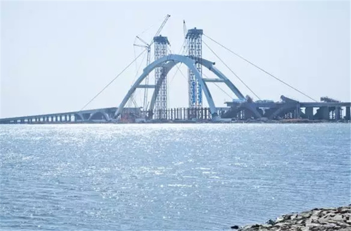盘锦桥中桥和东桥合同总吨位1.24万吨,其中中桥位于沿海内湖,整个项目施工区域均在回填的软基土上进行,施工难度巨大,该桥全长2310m,主桥钢拱肋结构形式复杂,拱肋矢高69m,跨径200m,拱径重约4000余吨。