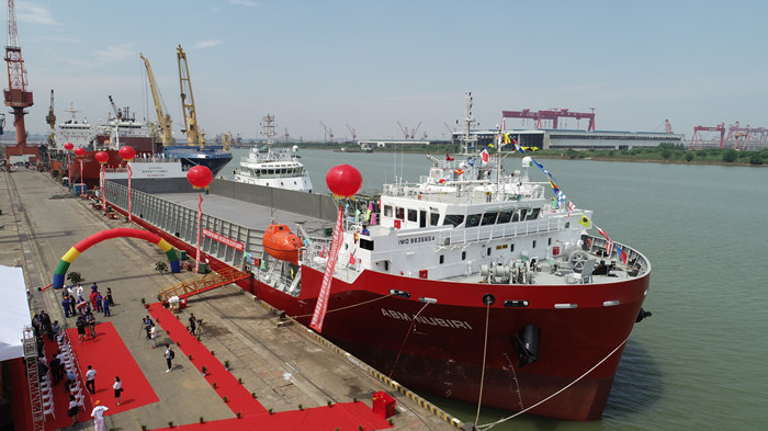 交付仪式现场,武船集团副总经理田军、三泰集团总裁金星阔、路易达孚集团总经理杜・艾玛纽、PT ABM公司总经理拉姆・马修、三星物产公司副总裁李秉顺先后致辞。三泰集团总裁夫人金海鸥女士随后为船只命名。