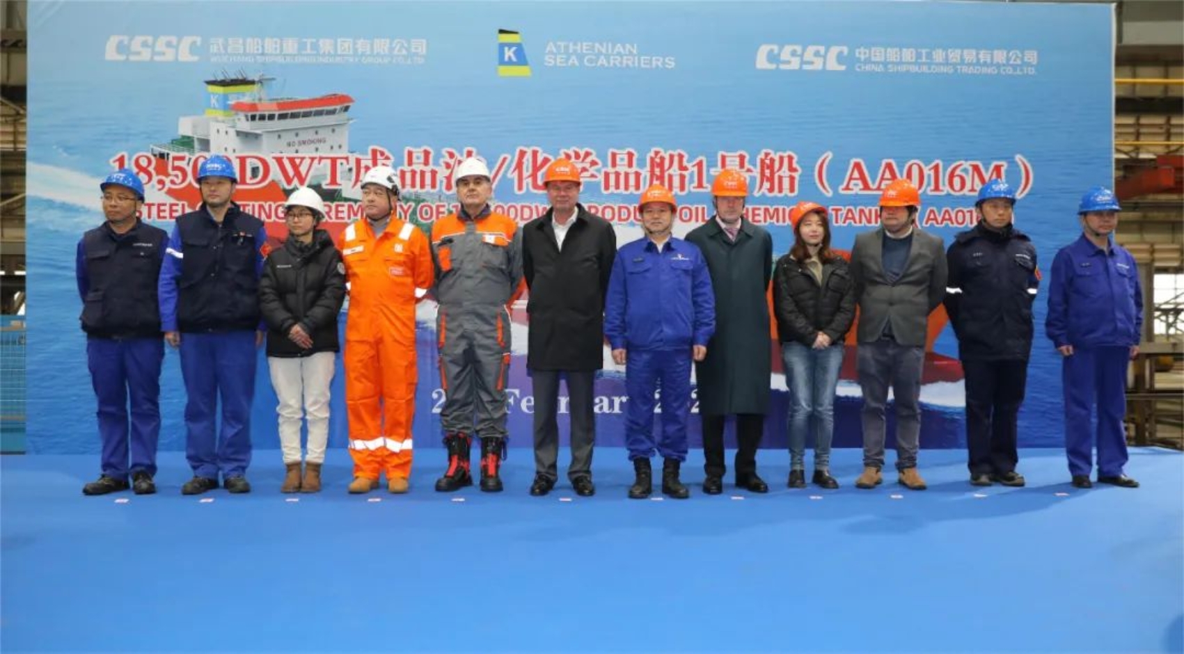 2月20日下午,由中国船舶集团武昌造船为希腊Athenian Sea Carriers公司建造的 18500DWT油化船1号船顺利开工。Athenian Sea Carriers、SeaQuest Marine、Braema、LR船级社、中船贸易及武昌造船等相关单位领导、来宾出席开工仪式。
