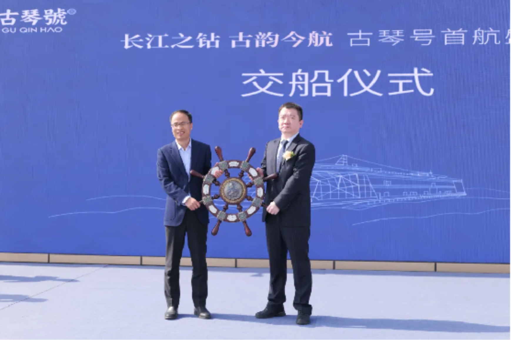 武昌造船党委书记、董事长姜涛与武汉文化旅游集团副总经理周伍华交换船舵,完成了船舶交接,这也标志着“古琴号”正式加入长江航运大家庭。
