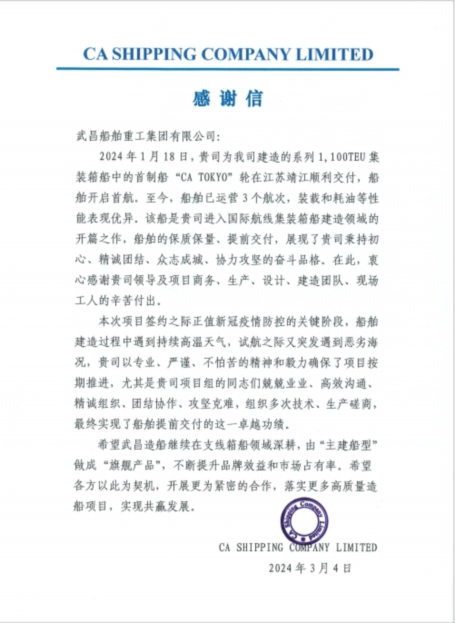 “1月18日,贵司为我司建造的系列1100TEU集装箱船中的首制船“CA TOKYO”轮在江苏靖江顺利交付,船舶开启首航。至今,船舶已运营3个航次,装载和耗油等性能表现优异。”——CA SHIPPING COMPANY LIMITED