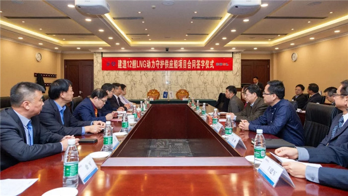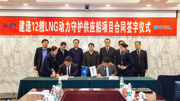 2018年11月30日下午,武船集团和中海油田服务股份有限公司签署两型8艘4000马力LNG动力守护供应船建造合同,中海油田服务股份有限公司船舶事业部党委书记、总经理车永刚和武船集团双柳武船党委书记、董事长杨国平代表双方在合同上签字。中海石油(中国)有限公司开发生产部副总经理刘建忠,中海油田服务股份有限公司CEO兼总裁、党委副书记曹树杰、副总裁兼安全总监余峰、装备总监兼装备管理部总经理王建军、采办共享中心总经理王冬石,中国船级社副总裁朱恺,天海融合防务装备技术股份有限公司董事长刘楠,武船集团经济运行部部长罗金华等相关领导及人员出席签约仪式。