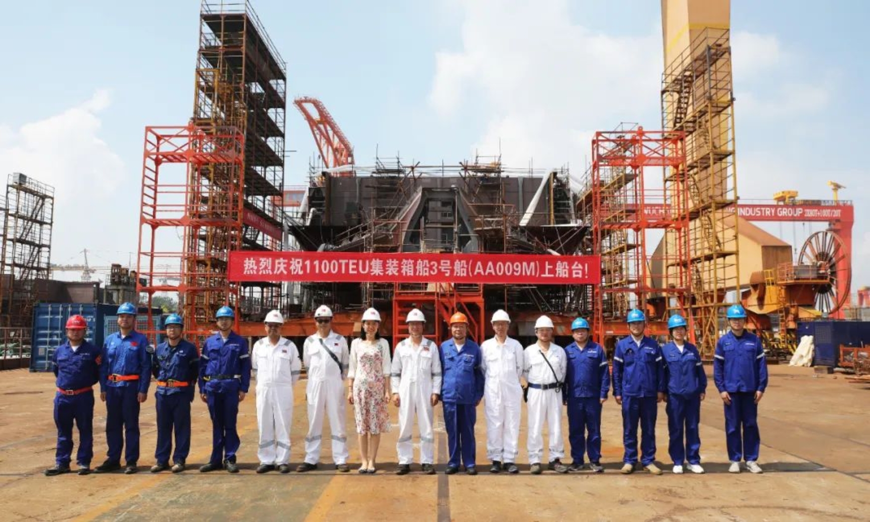 9月15日上午,由武昌造船承建的1100TEU集装箱船3号船实现上船台节点,这是武昌造船锚定全年目标任务不放松,有序推进生产节点取得的又一阶段性成果。船东、船检及相关单位领导参加仪式。