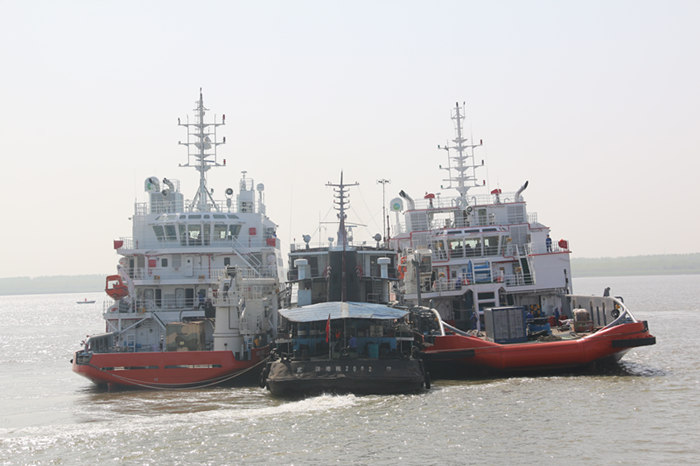 4月8日上午9点28分,由武船集团双柳武船承制的三型七艘船中45米WUV-4号船和58米AHTS-2号船同时驶离双柳基地1号系泊试验码头前往南通顺泰基地。