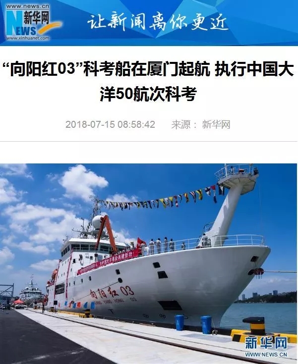 各大媒体纷纷报道的正是“向阳红03”船出发的消息�C�C7月14日,搭载着中国大洋50航次科考队的“向阳红03”船从厦门起航。