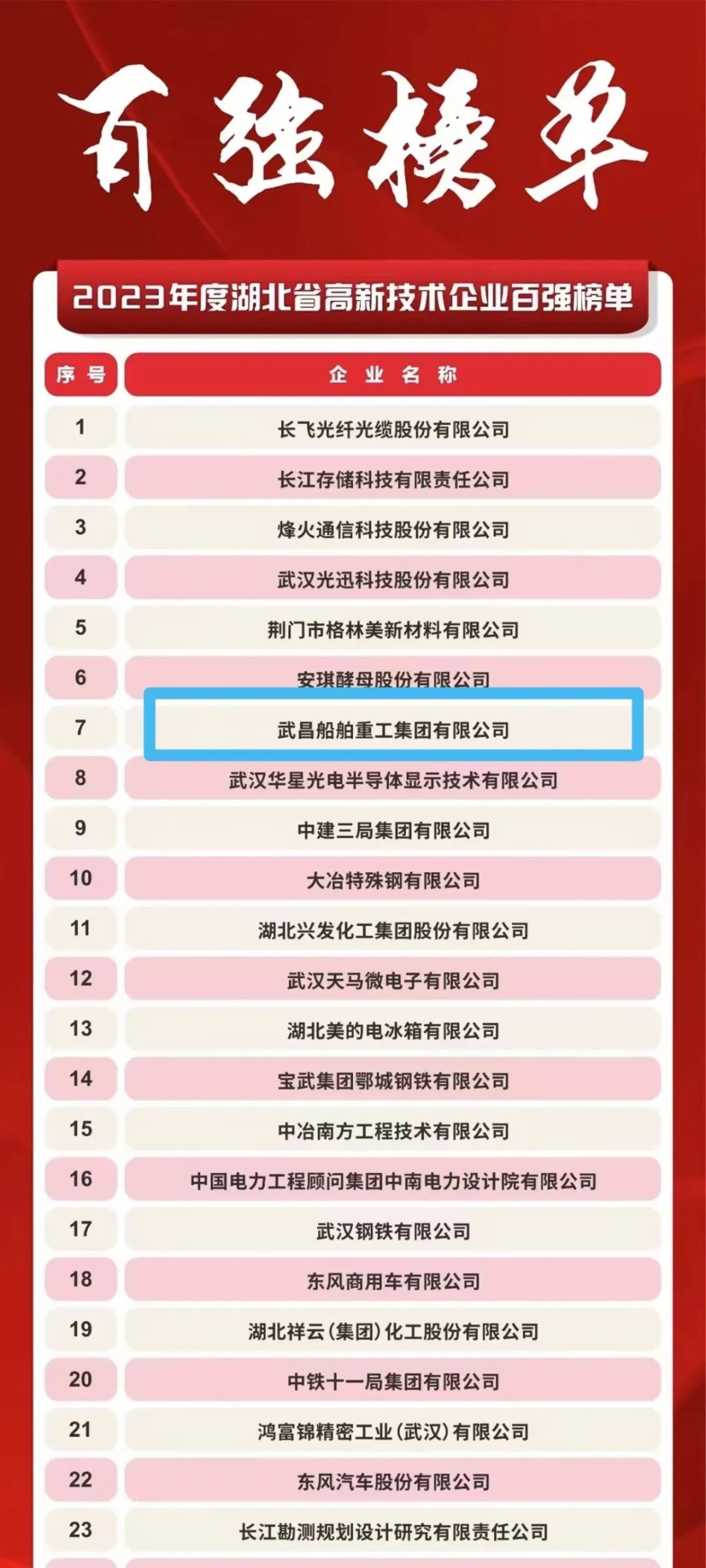 3月7日,湖北省科技厅组织召开了2024年湖北省高新技术企业“春晓行动”启动会,会上发布了湖北省2023年度高新技术企业百强名单,中国船舶集团武昌造船继2022年度后再次上榜,且排名从2022年度的第62名上升至第7名。