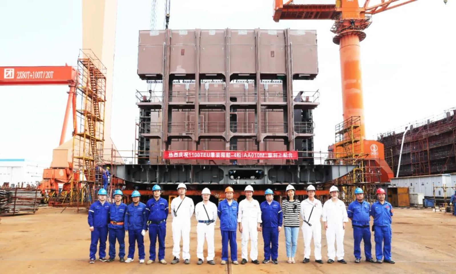 10月8日,由武昌造船承建的1100TEU集装箱船4号船顺利实现上船台节点。至此该批一型四艘船最后一艘船正式转入船台搭载阶段,为船舶顺利交付奠定坚实基础。船东、船检及参建单位相关负责人参加仪式。